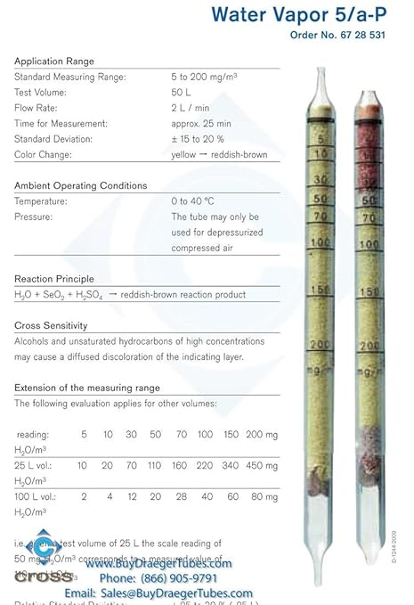 Extension of measuring range listed is possible for some detector tubes. Draeger water vapor 3/a tubes range: Concentrations can be read directly from the color. Reagent produces a colorimetric indication in the presence of a particular gas, vapor, or aerosol. Default measuring range 20°c, 1013 hpa.