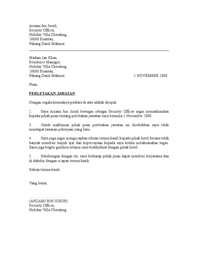 Contoh surat perletakan jawatan dalam bahasa inggeris. 4 contoh surat letak jawatan ikut situasi notis 24 jam 2 minggu sebulan versi bm surat pengikut minggu. Antaranya ialah surat letak jawatan 24 jam,letak jawatan dalam masa 30 hari dan sebagainya. So, di sini saya nak bg contoh surat rasmi untuk letak jawatan. Surat kuasa dibuat oleh seseorang yang memiliki kesibukan atau halangan tertentu dan diberikan kepada orang lain yang terpercaya dikarenakan yang bersangkutan tidak dapat melakukan suatu hal. Selain telepon dan handphone, ternyata menulis surat pribadi masih orang gunakan sebagai sarana saling bertukar kabar, keberadaannya masih sangat diperlukan di era digital sekarang ini. Nak masuk kerja ada adab, nak berhenti kerja pun kenalah ada adabnya juga. Ahmad idham no 112 jalan gemilang. Apabila anda ada hasrat untuk melepaskan jawatan di tempat kerja, anda diwajibkan memberitahu kepada pihak syarikat dengan menghantar surat perletakan jawatan. Contoh surat perletakan jawatan #3 imej via. Contoh surat perletakan jawatan notis sebulan. Pastikan tarikh letak jawatan adalah sama seperti tarikh notis berhenti iaitu sebulan, seminggu atau 24 jam bergantung kepada situasi anda atau pekerjaan anda. 5 contoh surat mou kerja sama yang benar berbagai keperluan.
