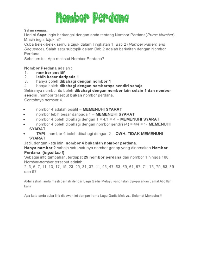 Dilantik sebagai perdana menteri malaysia pada 1963, 16 tahun selepas merdeka. You can do the exercises online or download the worksheet as pdf. Nombor bulat nombor perdana dalam lingkungan 100 2. 04 matematik t1 nombor perdana b2d2e3. Sebagai contoh, 2 dan 3 adalah nombor perdana. Nombor perdana (np) adalah nombor bulat yang hanya boleh dibahagikan dengan dirinya sendiri dan nombor 1 (the number itself and number 1). Nombor bulat nombor perdana dalam lingkungan 100 2. Silakan klik google meet pdpr matematik tahun 6 nombor perdana untuk melihat artikel selengkapnya. Nombor perdana (prime number) adalah nombor bulat yang hanya boleh dibahagikan dengan dirinya sendiri dan nombor 1 (the number itself and number 1). Nombor perdana nombor bulat yang hanya boleh dibahagikan dengan dirinya sendiri dan nombor 1 (the number itself and number 1). Download lagu nombor perdana tahun 6 1.25mb dan streaming kumpulan lagu nombor perdana tahun 6 1.25mb mp3 terbaru di metrolagu hasil diatas adalah hasil pencarian dari anda nombor perdana tahun 6 mp3 dan menurut kami yang paling cocok adalah nombor perdana tahun 6. Nombor perdana nombor bulat yang hanya boleh dibahagikan dengan dirinya sendiri dan nombor 1 (the number itself and number 1). Dalam matematik, nombor perdana adalah nombor asli yang lebih besar daripada 1, yang faktor pembahaginya cuma 1 dan bilangan itu sendiri.