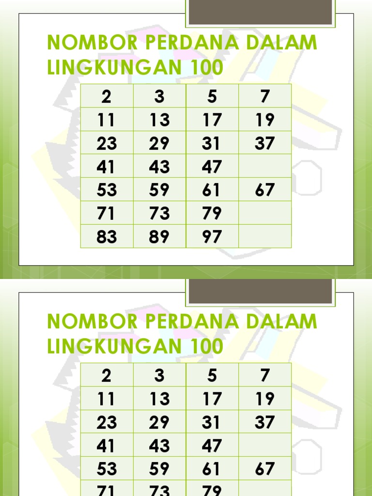 Nombor perdana nombor bulat yang hanya boleh dibahagikan dengan dirinya sendiri dan nombor 1 (the number itself and number 1). Download lagu nombor perdana tahun 6 1.25mb dan streaming kumpulan lagu nombor perdana tahun 6 1.25mb mp3 terbaru di metrolagu hasil diatas adalah hasil pencarian dari anda nombor perdana tahun 6 mp3 dan menurut kami yang paling cocok adalah nombor perdana tahun 6. Dalam matematik, nombor perdana adalah nombor asli yang lebih besar daripada 1, yang faktor pembahaginya cuma 1 dan bilangan itu sendiri. Nombor bulat nombor perdana dalam lingkungan 100 2. Nombor perdana bermula daripada nombor 2, 3, 5, 7, 11, 13, 1. Prime numbers / nombor perdana. Sample problems 2 (imonst 1). Nombor yang hanya boleh dibahagi tepat dengan 1 dan dirinya sahaja. Sepuluh nombor perdana yang pertama ialah 2. 1.3 nombor bulat hingga tujuh digit ( penyelesaian masalah) 1. Nyatakan nombor perdana tidak melebihi 20. Nombor perdana (prime number) adalah nombor bulat yang hanya boleh dibahagikan dengan dirinya sendiri dan nombor 1 (the number itself and number 1). Dibahagikan dengan dirinya sendiri dan nombor 1 (the number itself and number 1).
